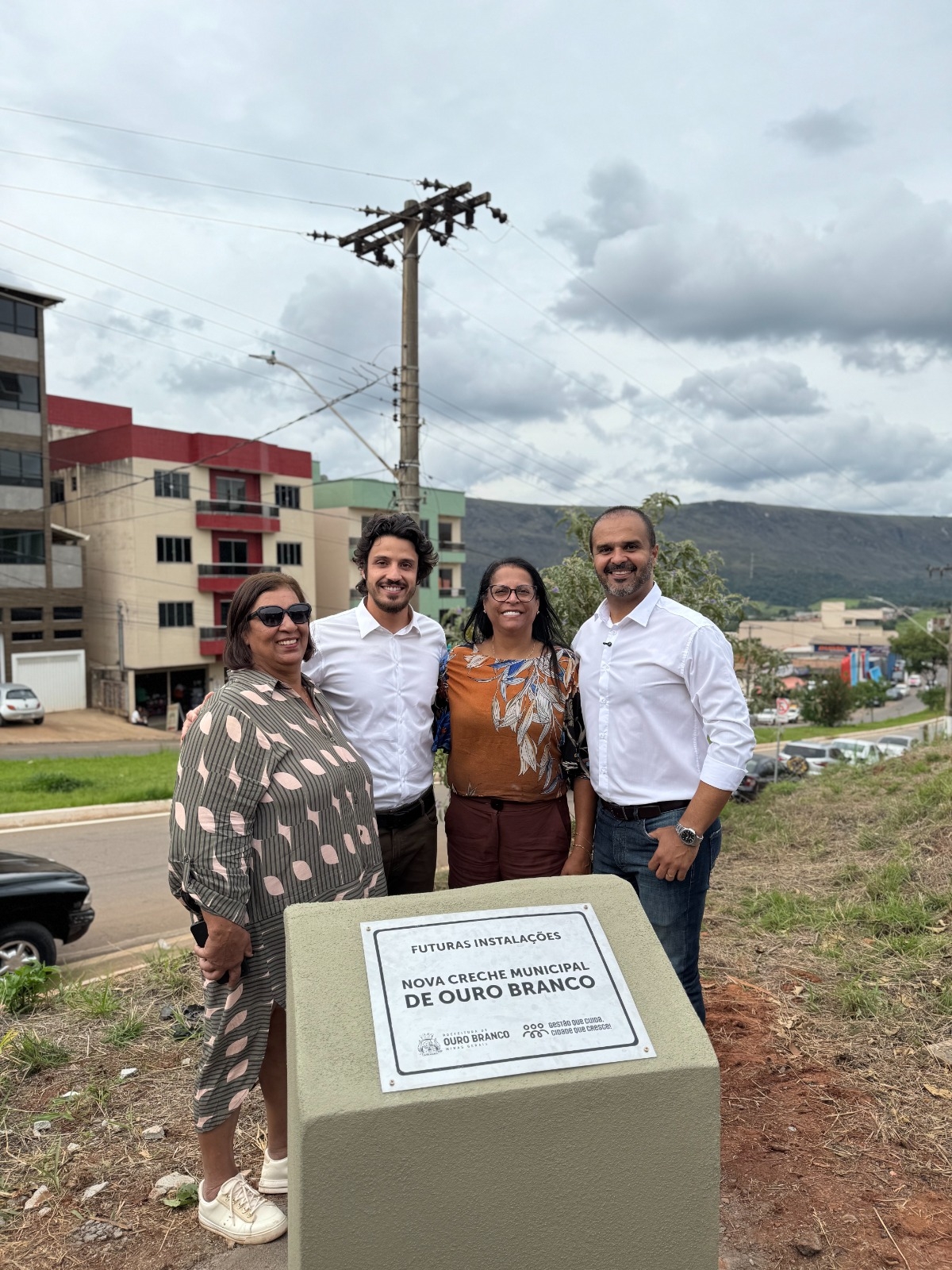 Após as falas, autoridades e convidados se dirigiram ao local destinado à construção para o lançamento oficial da pedra fundamental. O ato marca o início concreto das obras da nova creche e simboliza o primeiro passo para transformar em realidade um projeto esperado pelas famílias ouro-branquenses.
